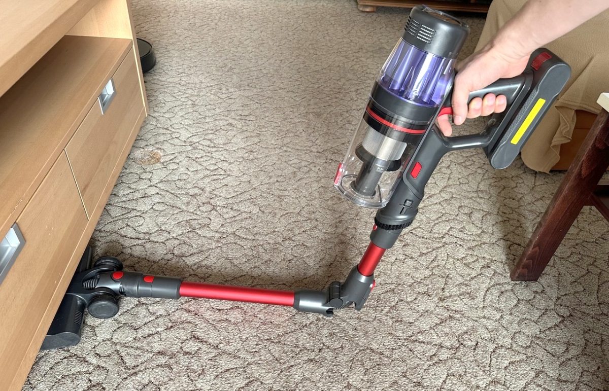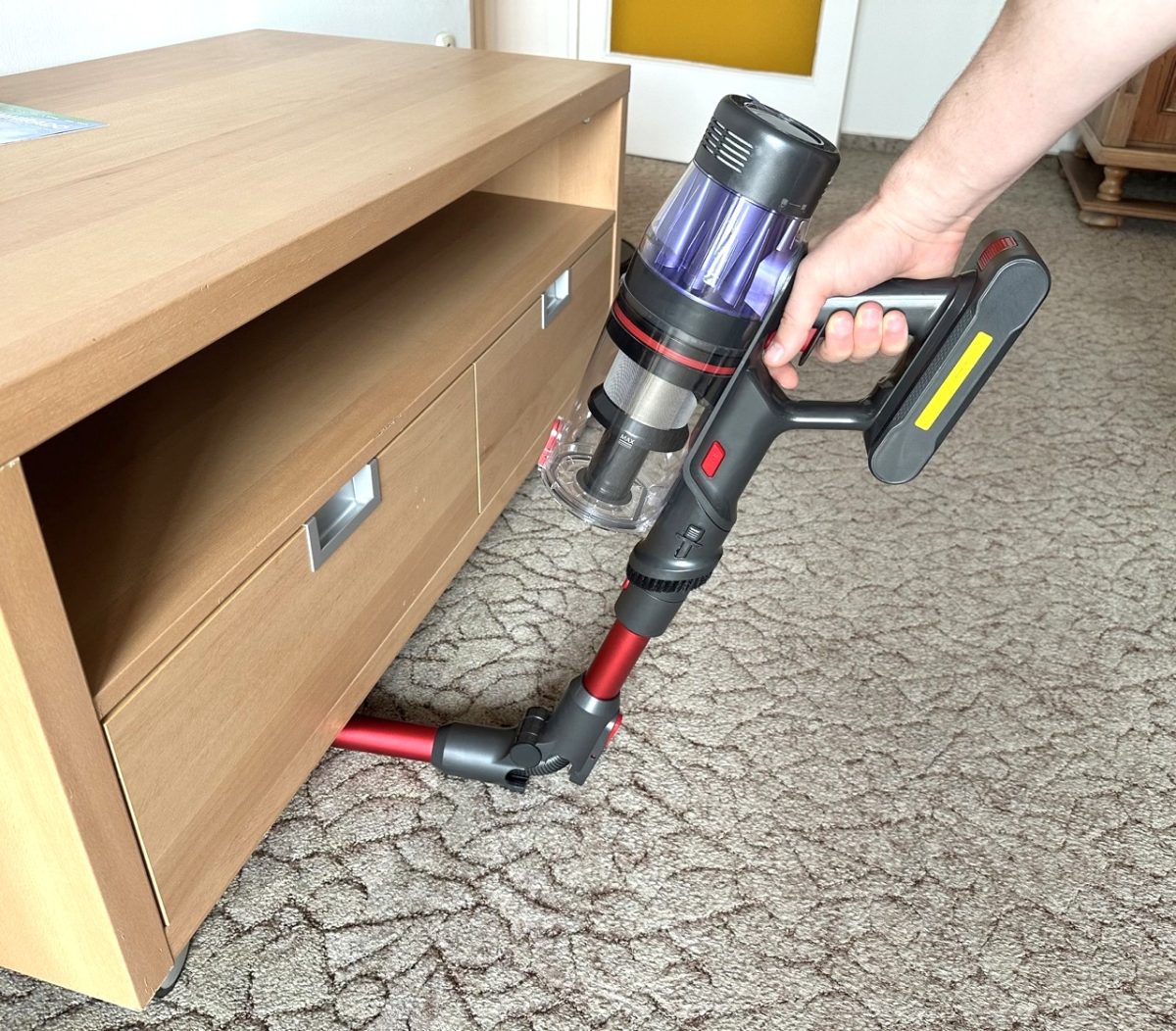 A felsorolt előnyök mellett az Ultenic U16 Flex egyik érdekes funkciója (erre utal a neve is), hogy az egyenes csövet középen meg lehet hajlítani, így nem kell hasra feküdnünk, ha valami alacsony helyre akarjuk betolni, kényelmesen takaríthatunk a bútorok alatt is. Ez a könyök egyébként jól működik, nem lötyög, stabilan tart.