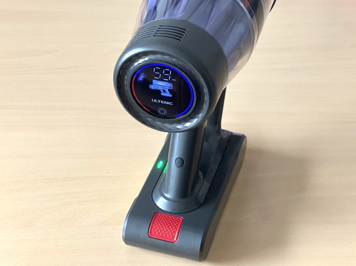 Az Ultenic U16 Flex egy 8 db cellából álló akkumulátorral bír, ami könnyedén cserélhető, és külön is tölthető a mellékelt adapterrel. A gyártó által megadott maximális üzemidő 60 perc, és ezt hozza is a készülék. Nálunk Eco, vagyis takarékos módban, forgófej nélkül 71 perc után kapcsolt ki álló helyzetben. A kijelző egyébként ki is írja a hátralévő üzemidőt percben mérve, és ez hozzávetőlegesen pontos.
