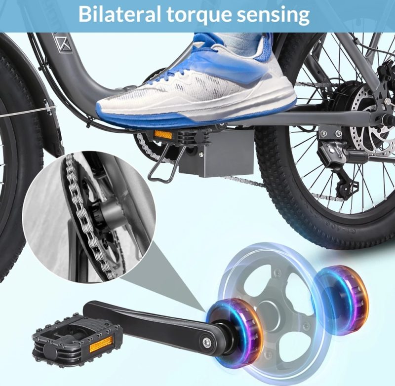 A kétoldali nyomatékérzékelő folyamatosan figyeli a pedálra kifejtett erőt, és ehhez lineárisan igazítja a motor teljesítményét. Ennek eredménye a folyamatos, természetes tekerési élmény, rángatás vagy hirtelen gyorsulás nélkül, ami különösen előnyös városi környezetben.