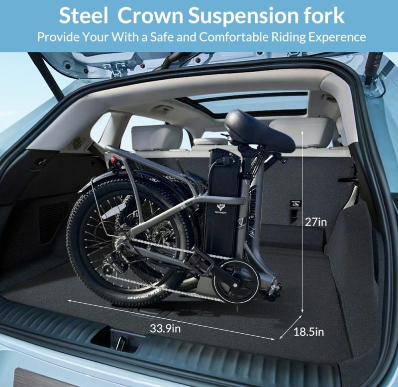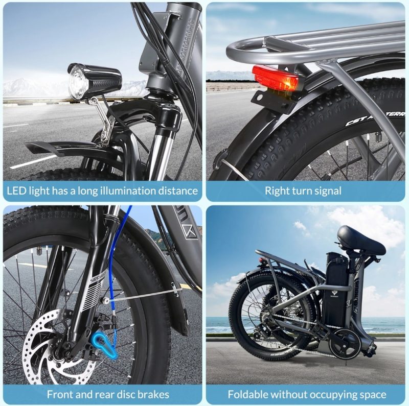 A felszereltség terén a gyártó szemmel láthatóan nem kötött kompromisszumot. A 20 colos kerekekkel és masszív vázzal rendelkező elektromos kerékpár 120 kg-os terhelhetőséggel bír, míg az úthibák csillapításáról egy első teleszkópos villa gondoskodik. A megbízható lassítást első és hátsó mechanikus tárcsafékek biztosítják.