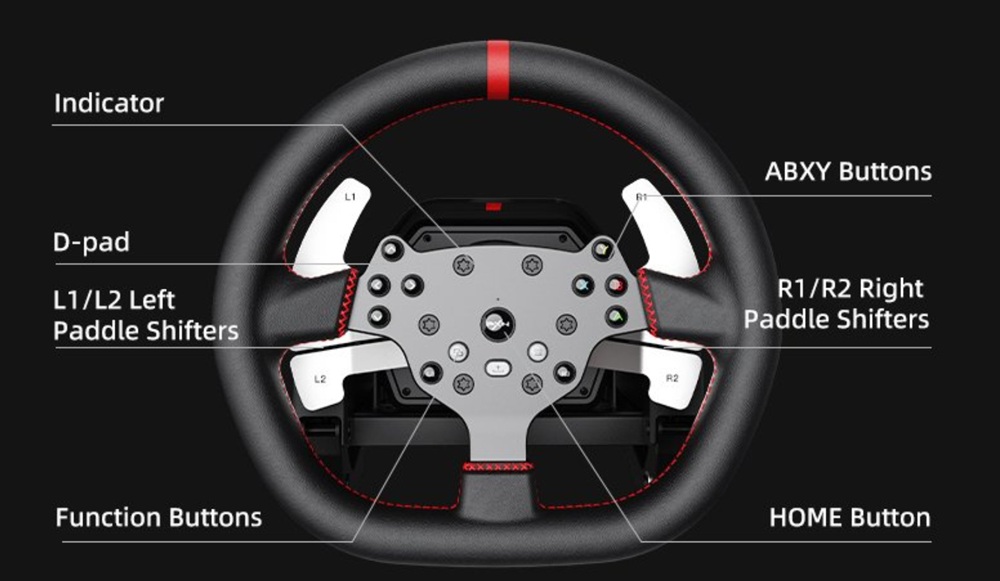 A kormány 17 programozható gombot tartalmaz, valamint F1 stílusú, mikrokapcsolós fém lapátváltókat a gyors váltásokhoz. A levehető, versenyautós stílusú kialakítás segíti a tárolást és a jövőbeni esetleges cseréket. A fém lapátváltók gyors működést biztosítanak, bár érzetüket tekintve az elvárások mérséklése szükséges lehet, de funkcionalitásban kiválóak.
