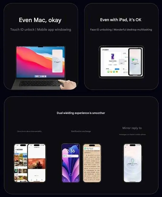 A rendszer a jövőben több eszközzel is képes lesz együttműködni, a Xiaomi ezúttal az Apple termékek felé nyitott. iPaden teljes multitasking támogatással futtathatóak a telefonos alkalmazások, Macen pedig akár három mobilalkalmazás-ablak is megnyitható. A Xiaomi telefonok az almás eszközökről közvetve feloldhatók lesznek Touch ID-val vagy Face ID-val is.