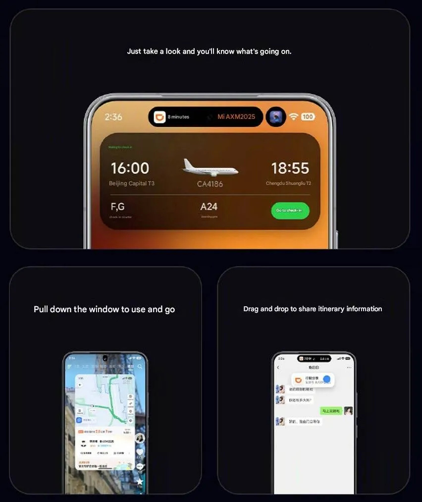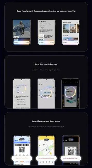 A HyperOS 3 intelligensebb MI eszközei leegyszerűsítik a feladatok végrehajtását. A Super XiaoAI Suggestion kontextusfüggő útmutatást nyújt, a One-Step Access pedig eszközön futó MI által működtetett gyorseléréseket kínál, ezek szeptemberben várhatóan több mint 80 alkalmazással és 1000 funkcióval lesznek kompatibilisek.